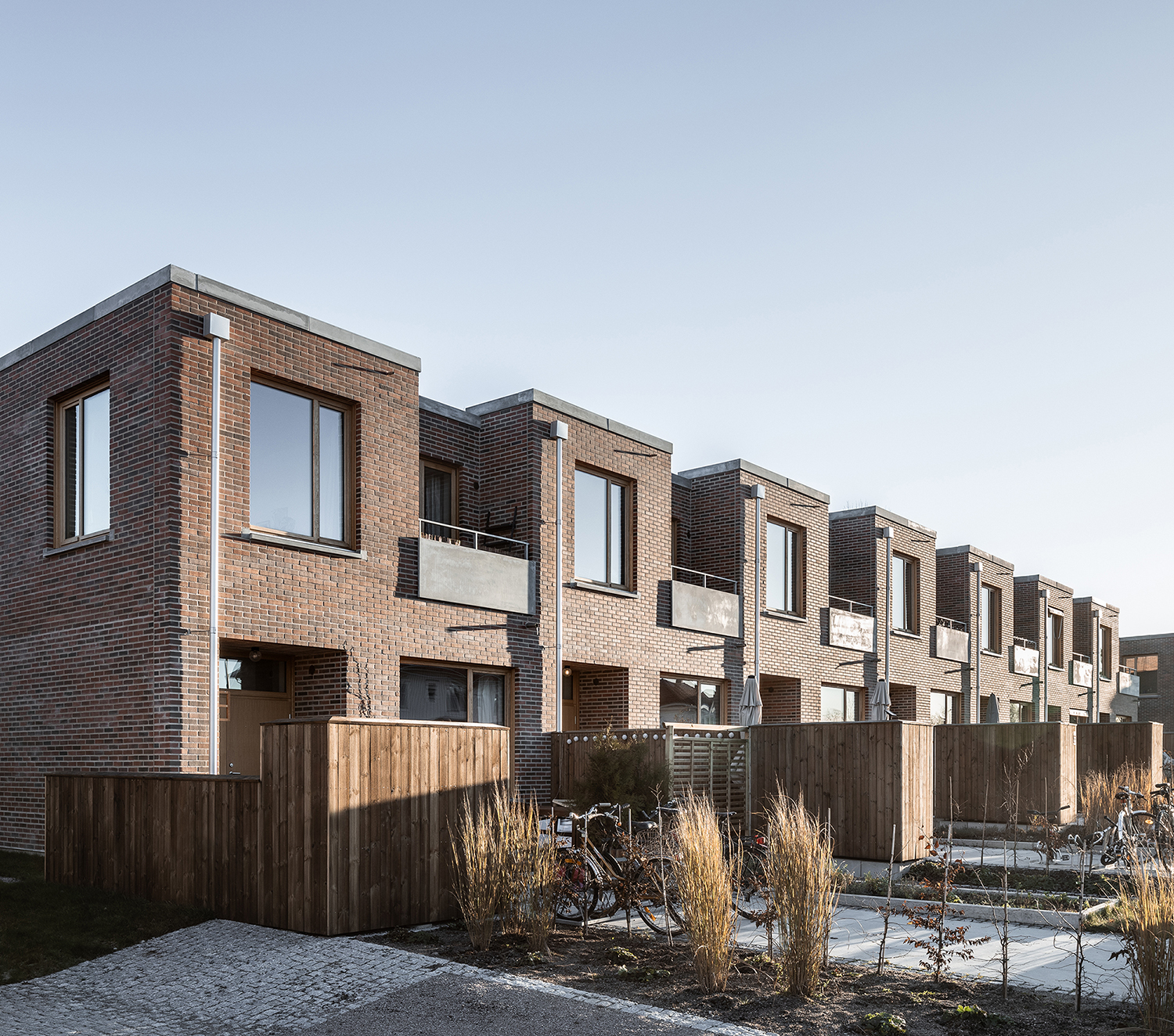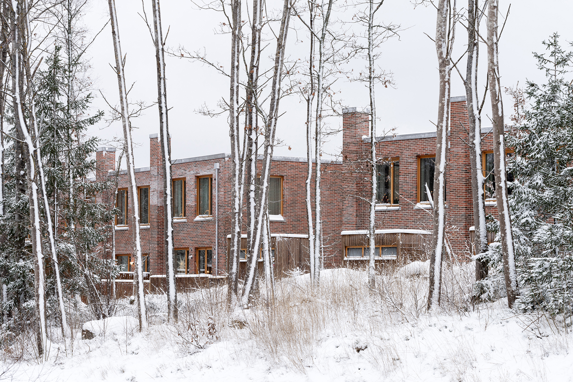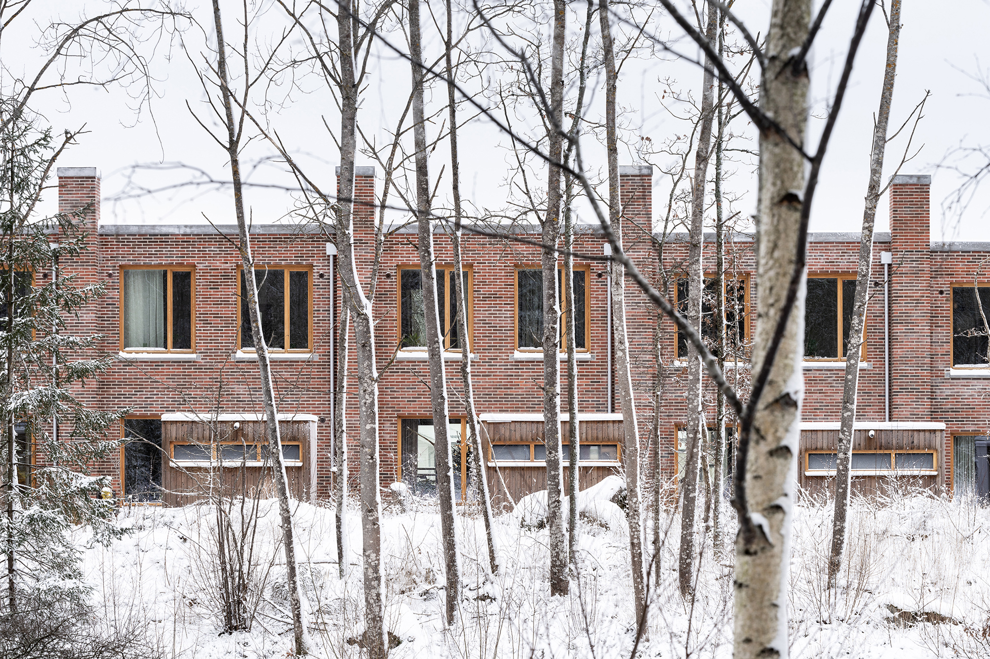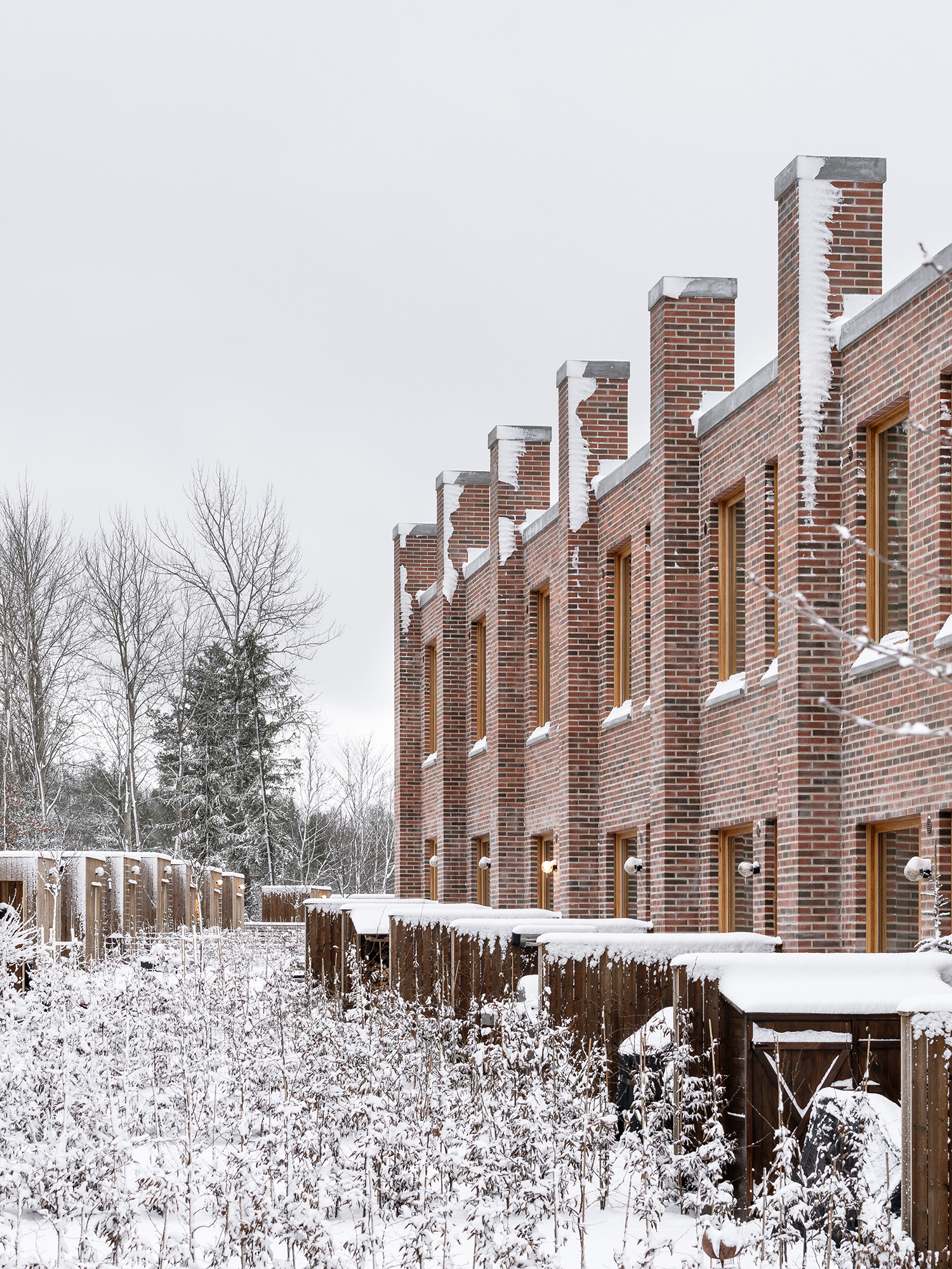The 23 red brick row houses are situated by Lake Mälarens most norden shore. The remains of an old brick quarry borders the site and although the bricks do not originate from this place they are produced only 20 km away. On the ground floor each house contains kitchen and living room with a ceiling height of three meters. The bedrooms are all located on the first floor with the master bedroom having its own balcony overlooking the front yard.